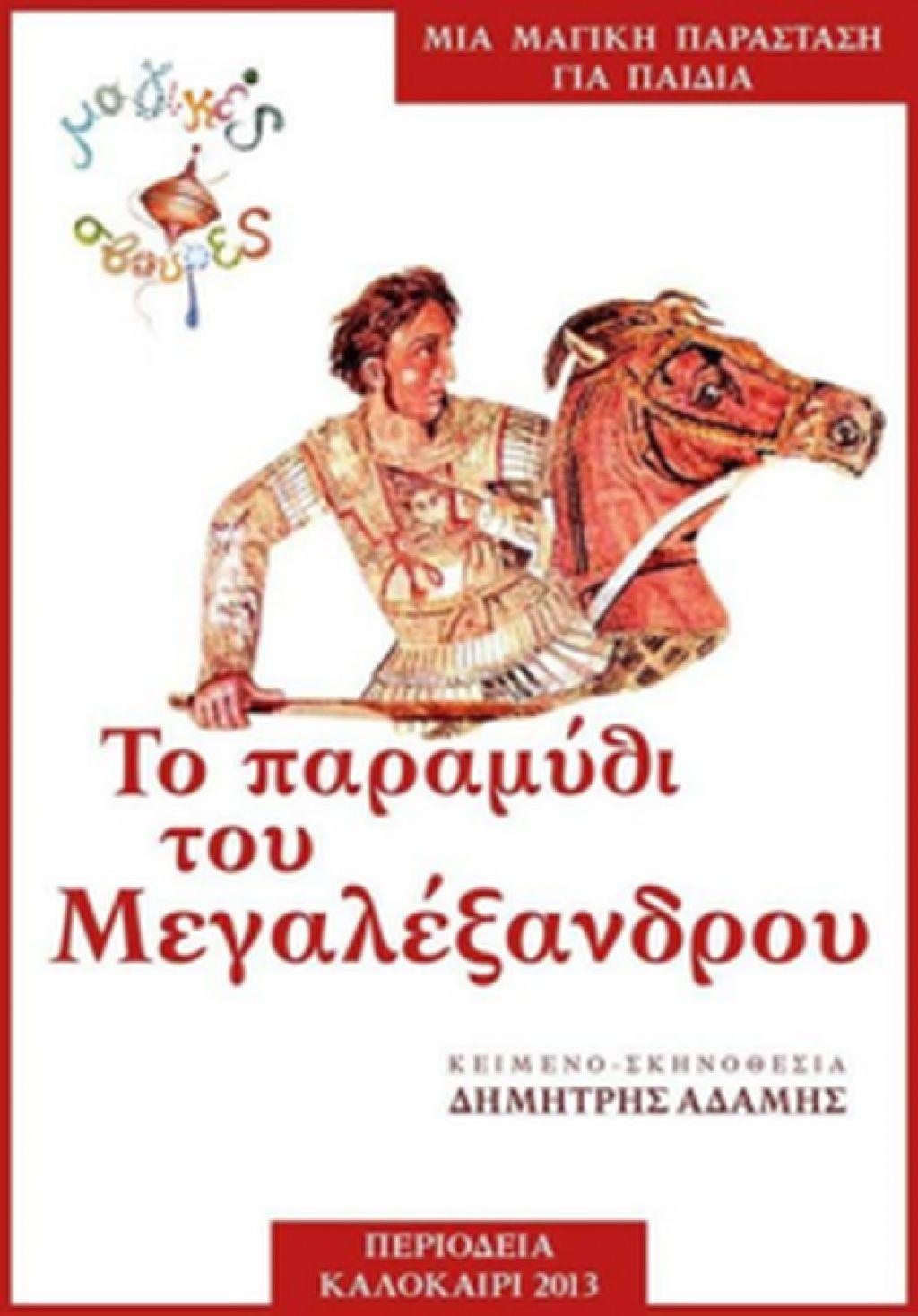 Οι μαγικές σβούρες παρουσιάζουν «Το Παραμύθι του Μεγαλέξανδρου» σε κείμενο και σκηνοθεσία Δημήτρης Αδάμης. Ένα μαγευτικό ταξίδι στην καρδιά της ελληνικής ιστορίας για όλη την οικογένεια.