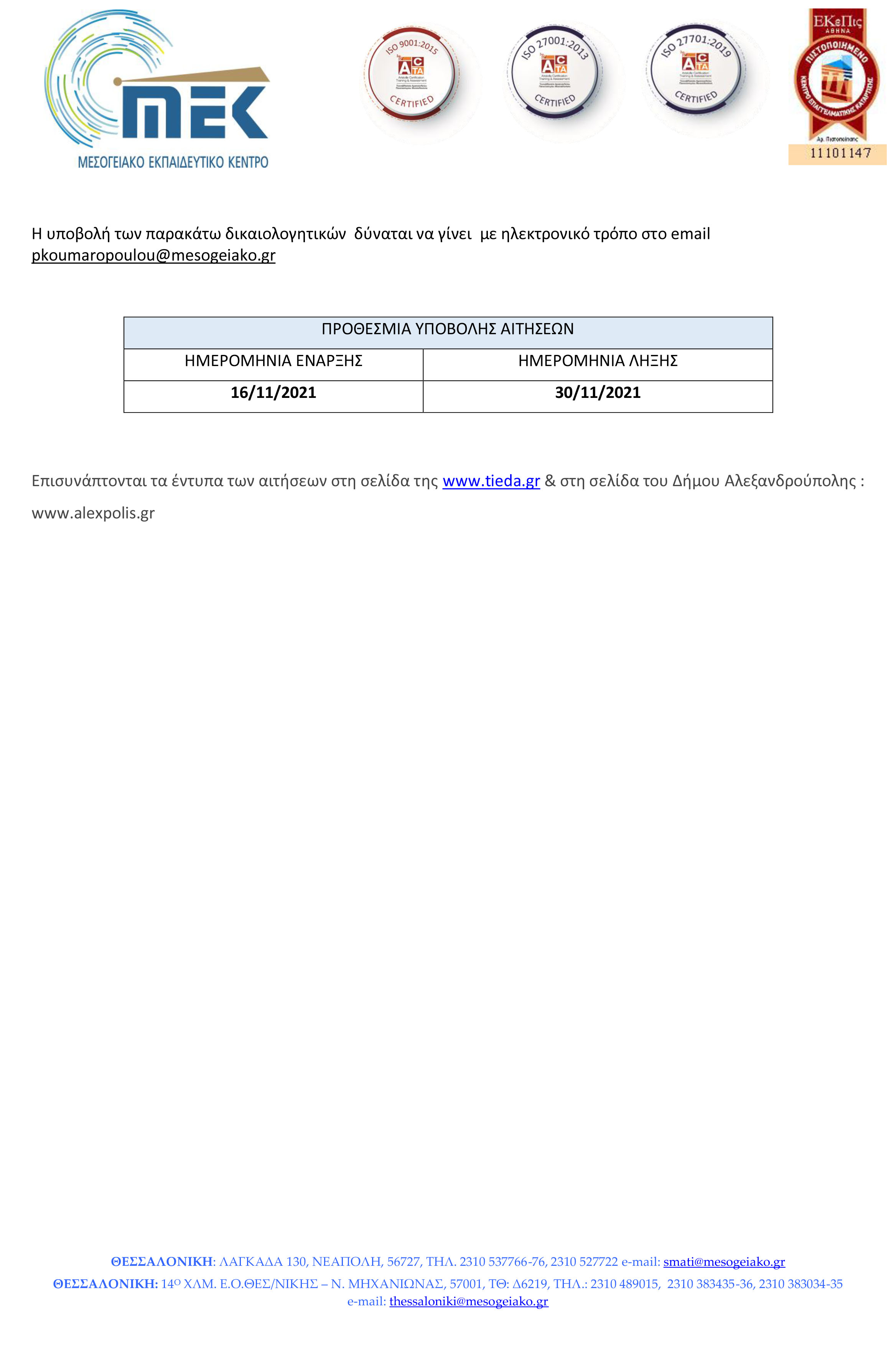 ΥΠΟΒΟΛΗ ΑΙΤΗΣΕΩΝ ΑΠΟ 16/11/2021 ΩΣ 30/11/2021